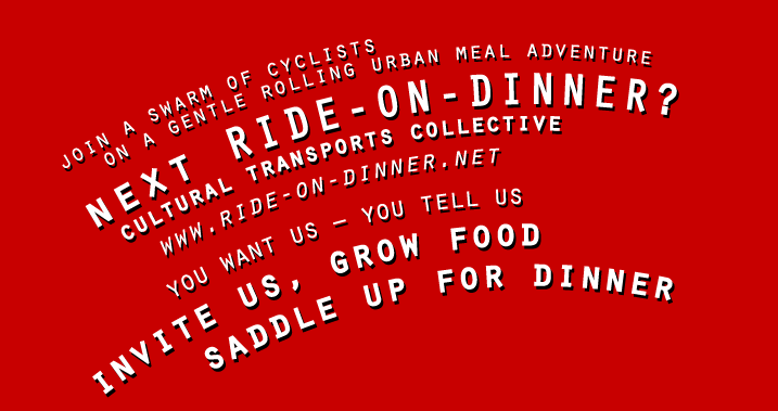 ITS OVER TO YOU! We offer the ride-on-dinner RECIPE to use however you like to make your own. Object Gallery have done it as part of the Sydney Design Festival; the Youth Food Movement have done it as part of the Sydney Food Festival. Hosting a ride-on-dinner brings together spontaneous communities in the joy of connecting to human-scaled food and transport systems through the body you've got. It works for festivals and place-based celebrations where people on the ground have know-how to share. We are happy to help you pedal your power. First to roll up, first for dinner.